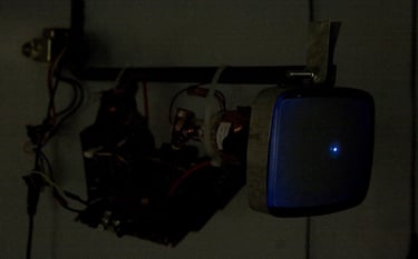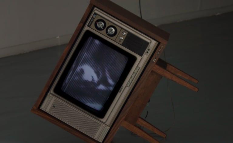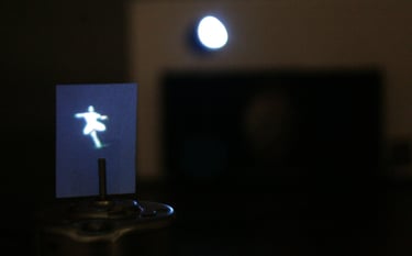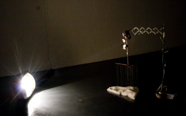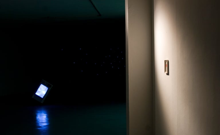 A is the dreamer. There is a background sound: insects in the night, scratched records playing in loop, a soft crystal melody. In a dimmed atmosphere seven installations meet each other and compose a fragile story.