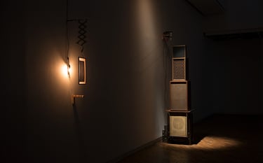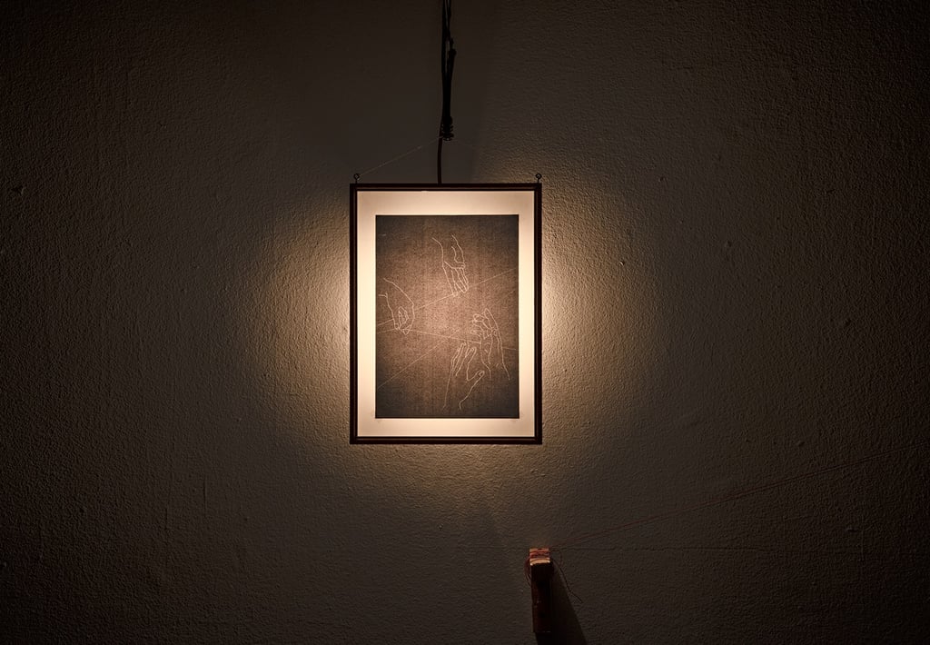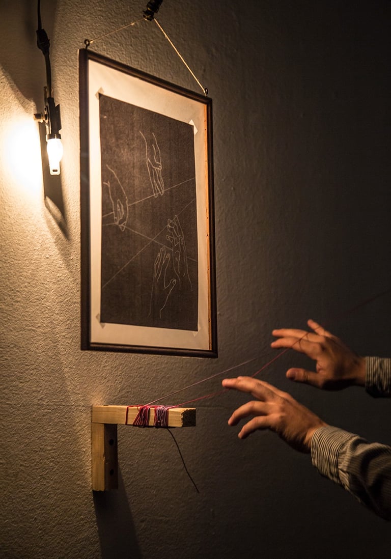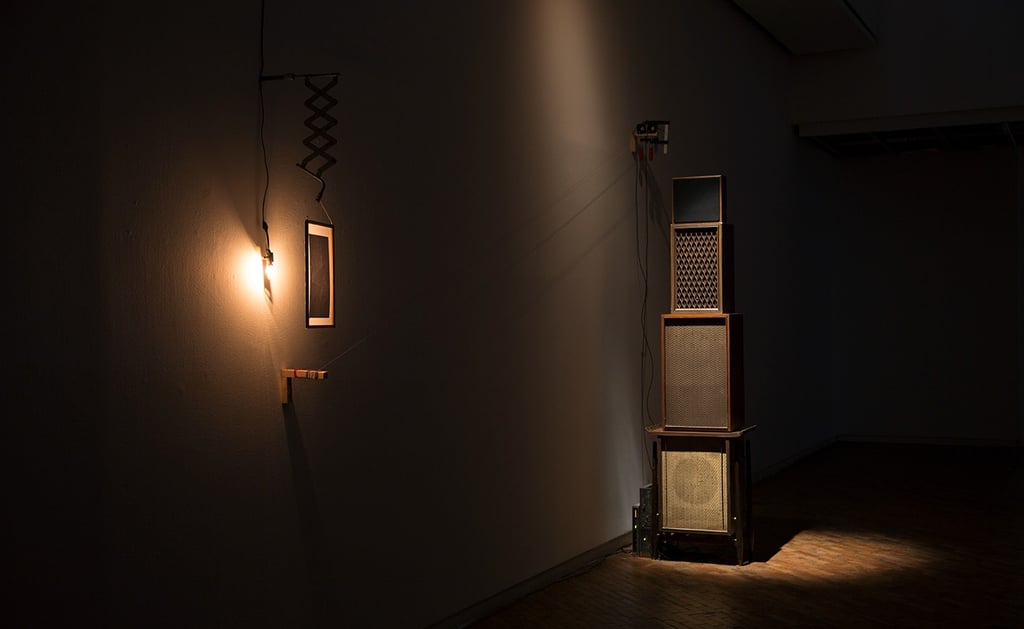 Participative installation with four wooden speakers, two sound amplifier, piezoelectric sensor, rubber wire, presses, wood, wooden frame, carbon paper, drawing and lamp.