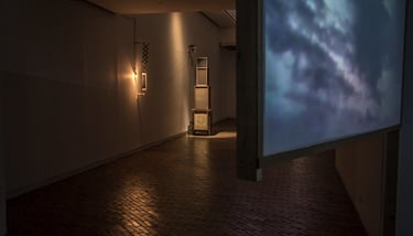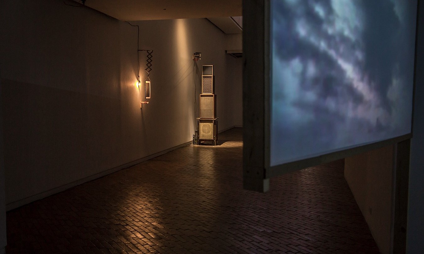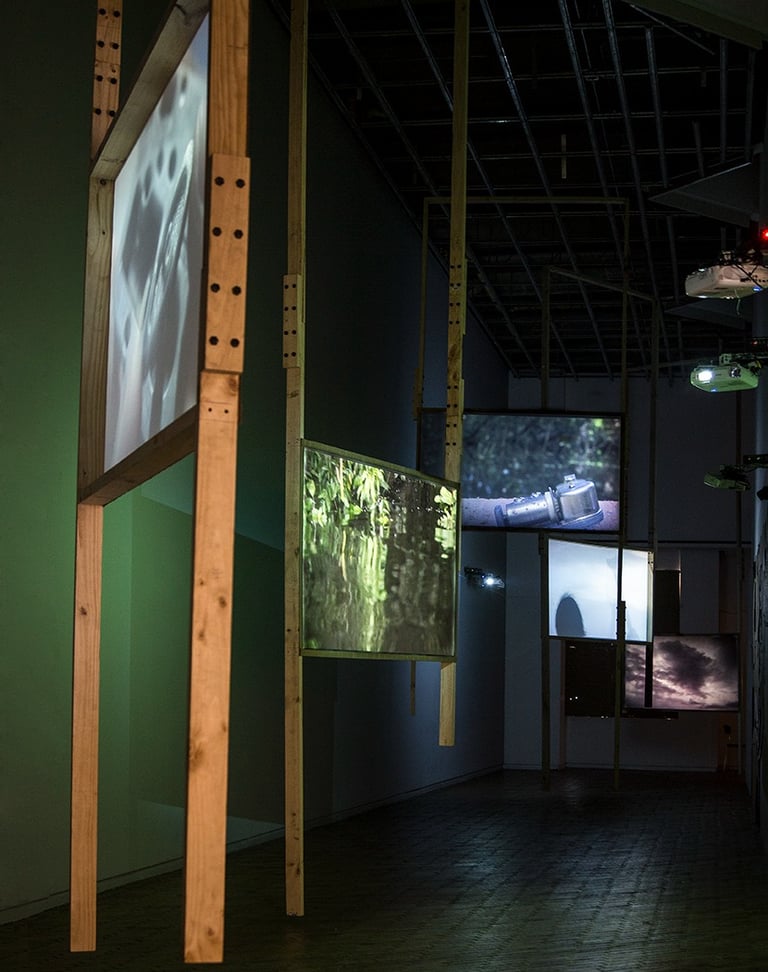 Installation with wood, wire, Swiss veil, screws, amplification system, five looped videos with sound.