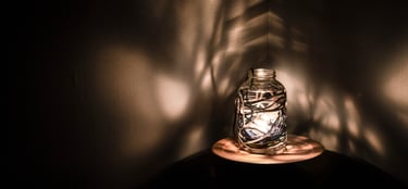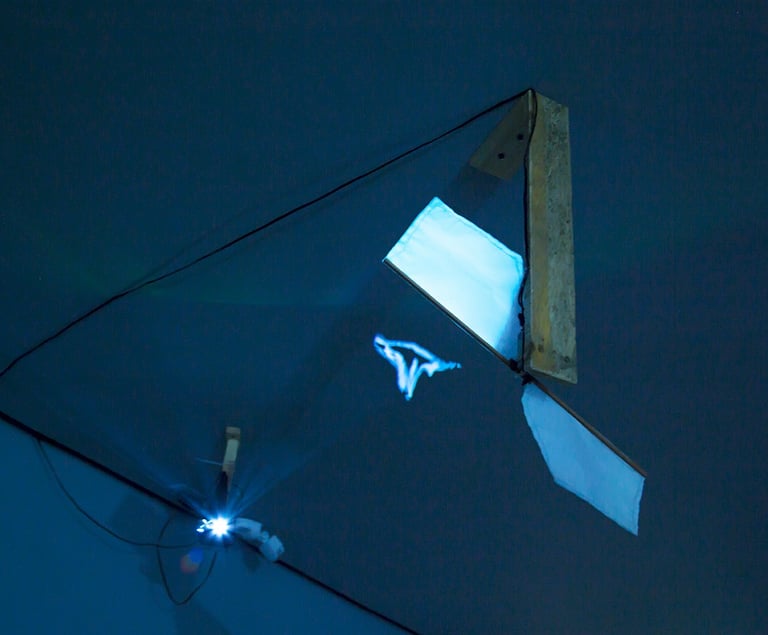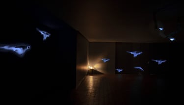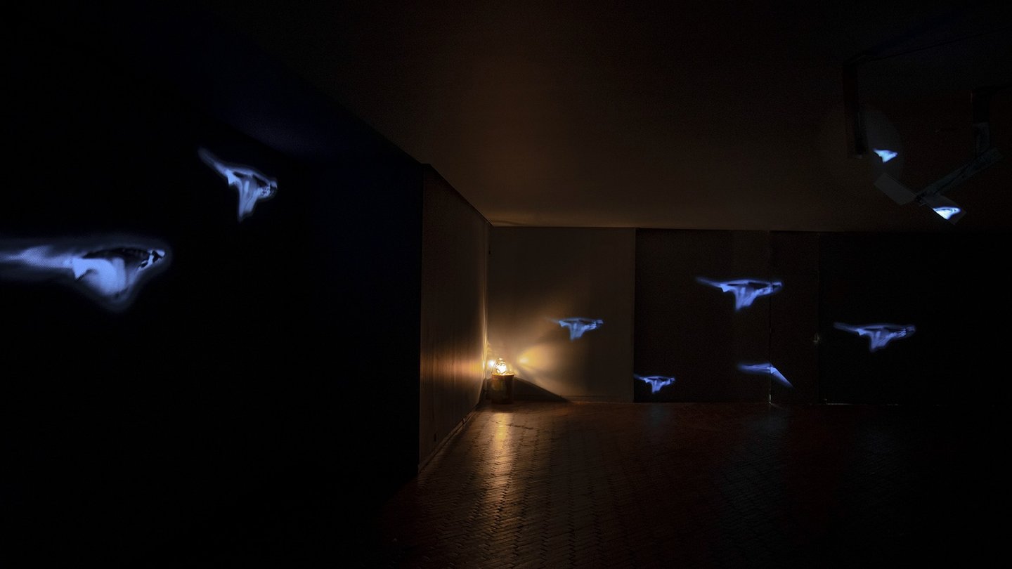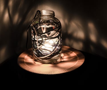 Video installation with electric motors, video, sound composition, glass jar, mineral oil, and light bulbs.