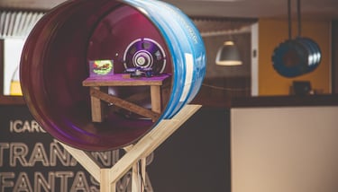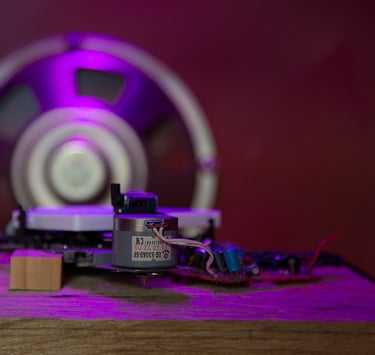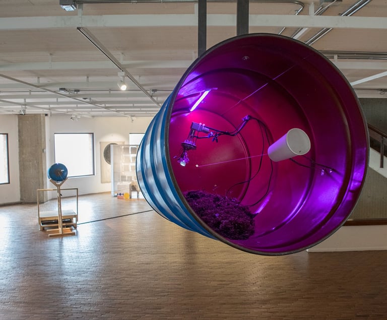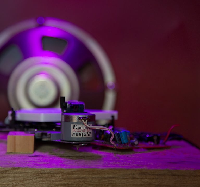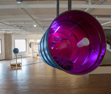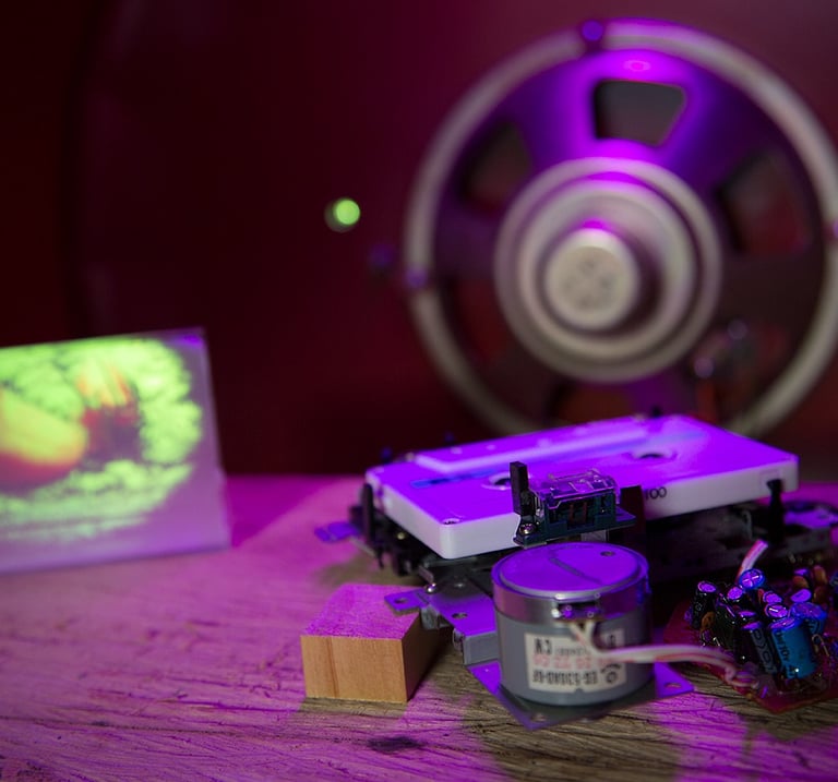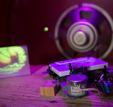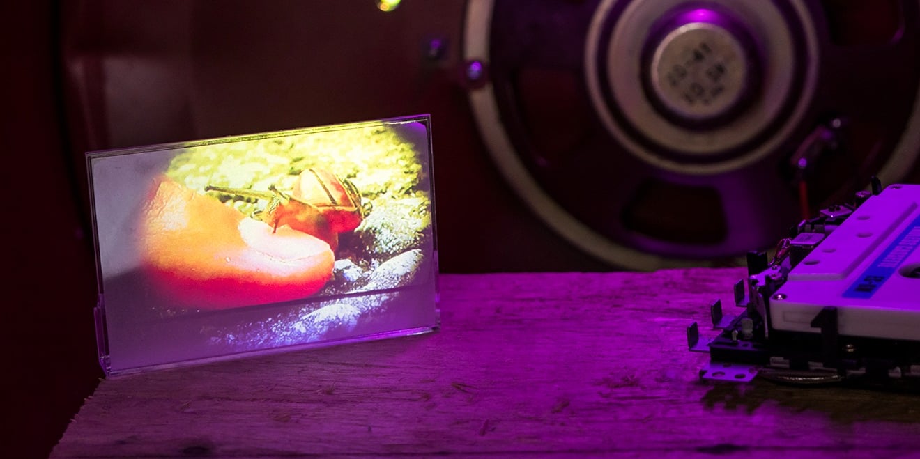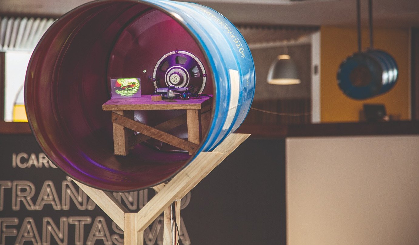 Installation with sound, endless cassette, cassette player, speaker, Chambira palm threat, paper cup, electric motor, soil, plants, video in loop, wood structure and two steel drums.