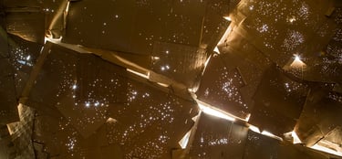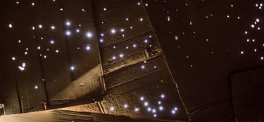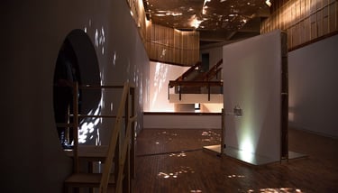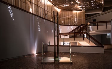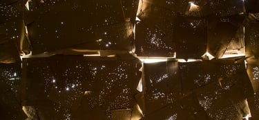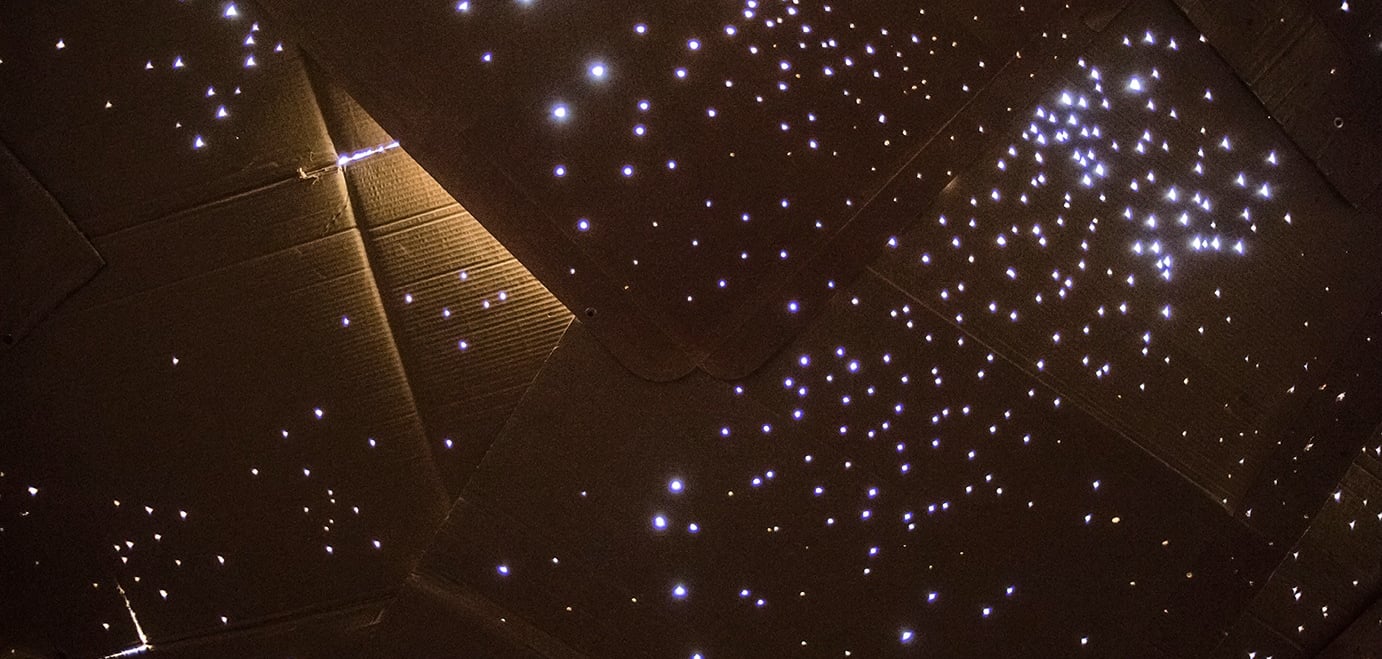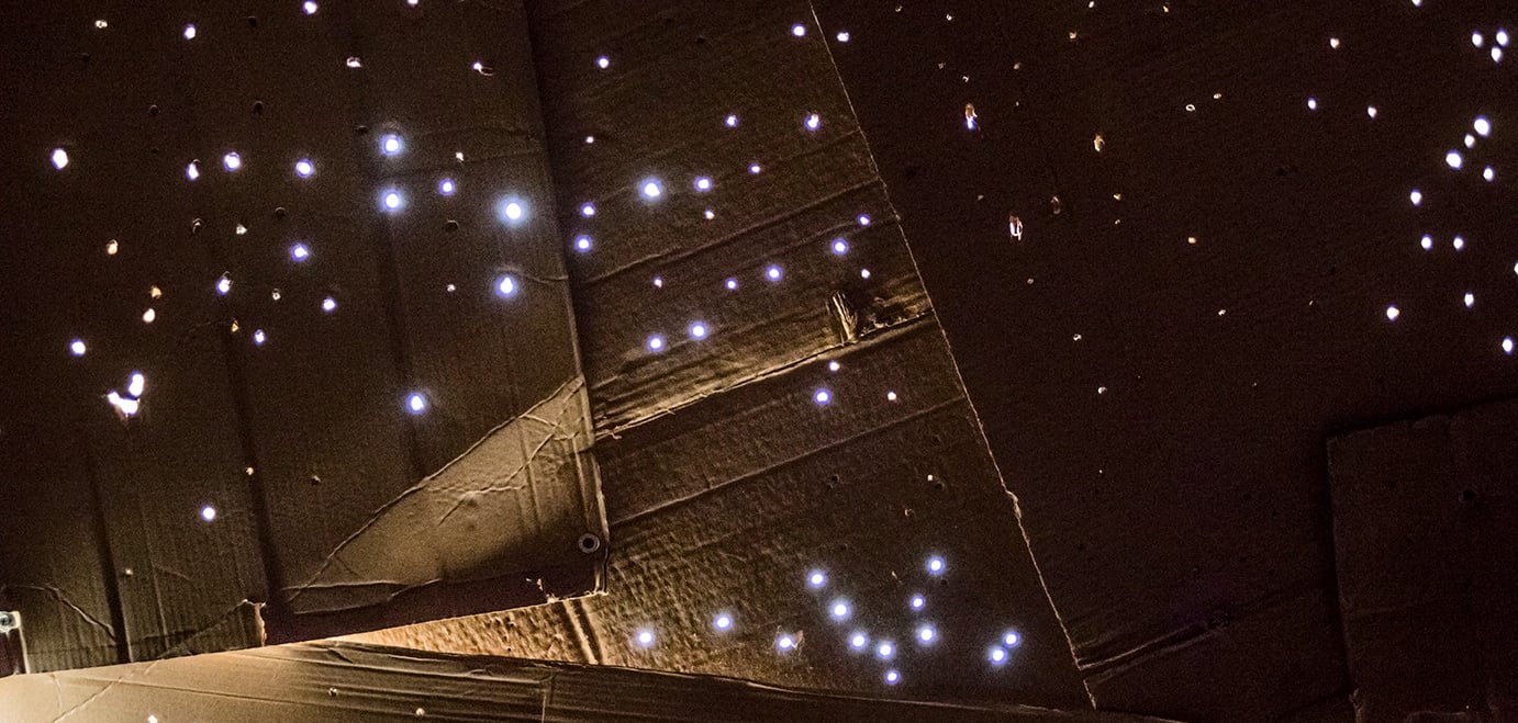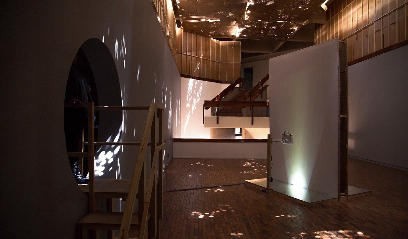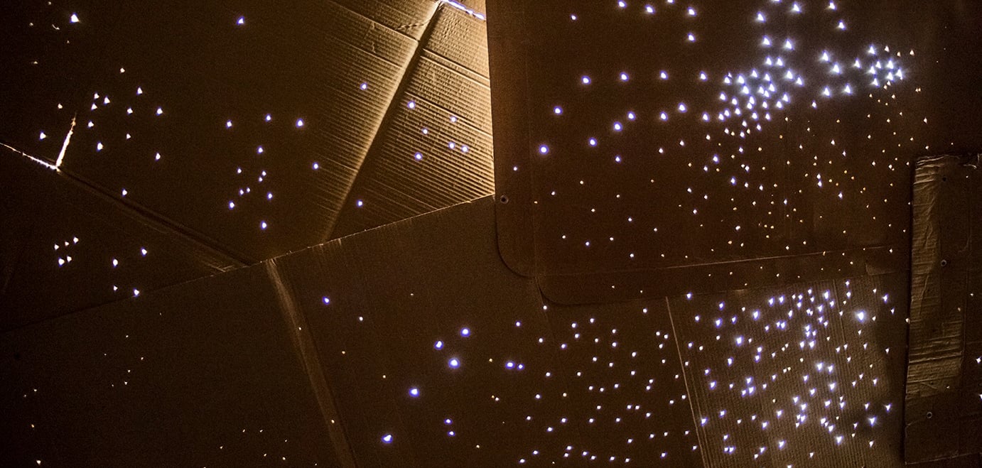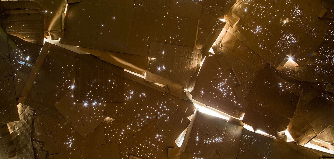 Site-specific intervention with five tons of recycled cardboard, wood, aluminum, staples, screws, wire, lamps and holes.
