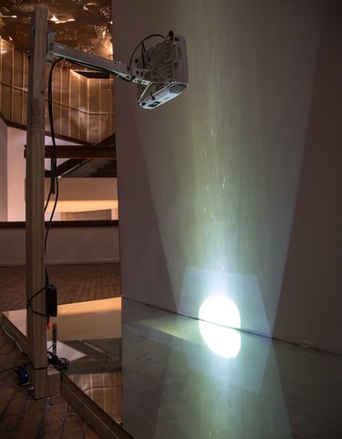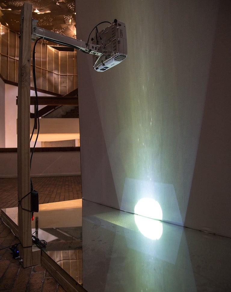 Installation with cardboard, wood, mirrors, video projectors, amplification system, loop video (2min. 26 sec.) and sound composition with fragments of scratched vinyl records of Franz Liszt’s preludes.